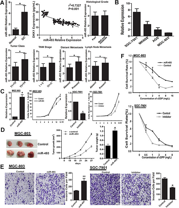 Figure 4: miR-493 promotes GC cells proliferation, invasion and chemo-resistance. (A) The expression pattern of miR-493 in serum of GC patients and normal control was evaluated by real-time RT-PCR. The expression correlation between DKK1 and miR-493 was analyzed in serum specimens of GC patients and normal controls. Furthermore, the distribution of miR-493 in serum of GC patients with different clinicopathologic parameters was also analyzed. *p < 0.01. (B) The level of miR-493 expression in different GC cell lines was detected by real-time RT-PCR. (C) The expression level of miR-493 was determined after expression interference, vs control, *p < 0.01. The role of miR-493 on cell proliferation was determined and the average cell number of each time point was indicated. (D) Tumor growth was monitored every 3 days. Tumor size and weight were recorded. Data are represented as a mean ± SD from three mice. vs control, *p < 0. 01. (E) The invasive potential was determined by transwell assay. vs related control, *p < 0.05, **p < 0.01. (F) miR-493 overexpression decreased the sensitivity of GC cells to cDDP, but miR-493 knockdown enhanced the chemo-sensitivity of GC cells.