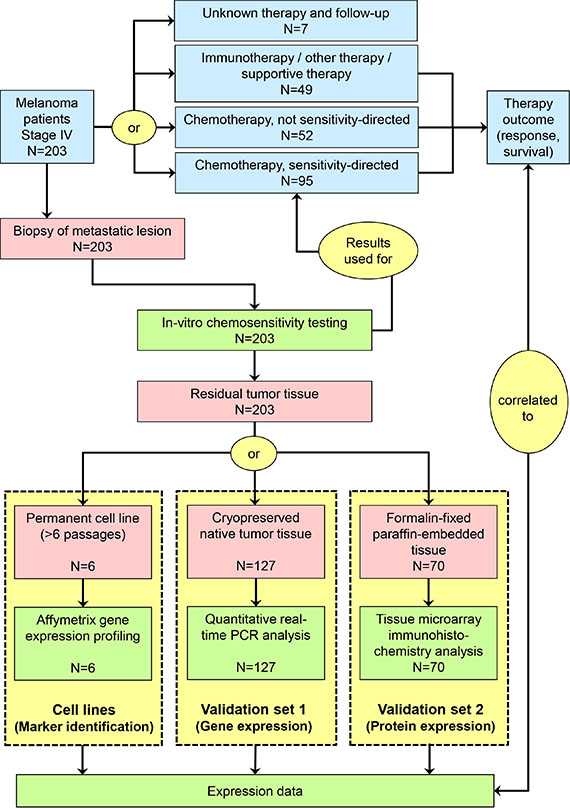 203 stage IV melanoma patients were subject of chemosensivity testing and subsequent workup of banked biomaterials throughout this study. This total population consisted of three independent sets of patients: six patients were investigated based on cell line materials (marker identification set), 127 patients were investigated based on cryopreserved tissue materials (validation set 1), and 70 patients were analyzed based on FFPE tissue samples (validation set 2) (Table 1, Figure 1). 62 patients from validation set 1, and 34 patients from validation set 2 participated in clinical multicenter trials of sensitivity-directed chemotherapy ([9]; ClinicalTrials.gov: NCT00779714).