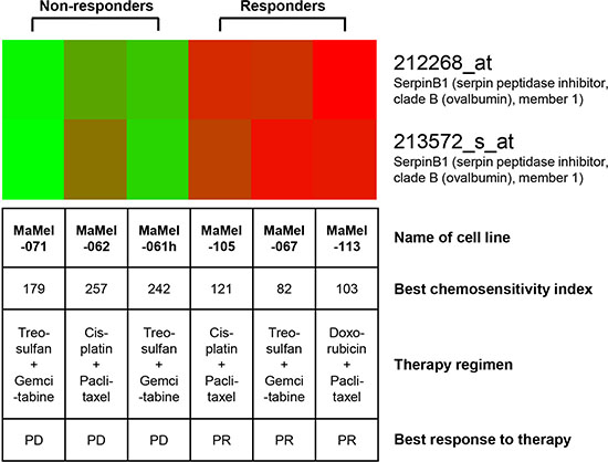 Taken together, we demonstrated in the present study that gene expression profiling from melanoma tissue is a useful tool to identify differentially expressed genes distinguishing chemosensitive from chemoresistant tumors. From five identified candidate genes, only one revealed a strong correlation to in vitro chemosensitivity and clinical chemotherapy outcome by experimental validation in two independent sample sets. Interestingly, the predictive association to in vitro and in vivo chemosensitivity could be confirmed for cisplatin-containing regimens only. The protein expression of this candidate gene, SERPINB1, proved as a strong and independent predictor of survival after cisplatin-based chemotherapy. Interestingly, all other chemotherapy regimens analyzed, as well as other therapy strategies like immunotherapy, showed no association to SERPINB1 expression. Thus, our results clearly show, that SERPINB1 expression in tumor tissue is not prognostic, like the majority of the already tested potentially predictive markers, but predictive only. This advantage emphasizes SERPINB1 as a useful marker predicting the outcome of cisplatin-based chemotherapies, and may help to personalize chemotherapy of melanoma. Notably, melanoma cell lines under long-term treatment with increasing doses of cisplatin revealed a reduction of SERPINB1 expression. However, knockdown of SERPINB1 expression by shRNA did not influence cisplatin sensitivity in melanoma cell lines.