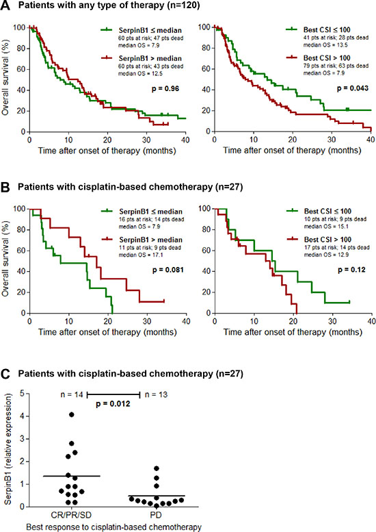 The relative expression of SERPINB1 as measured by qPCR in cryopreserved tumor tissues from validation set 1 was correlated to the patients clinical outcome. Overall survival was first analyzed in all patients with known clinical follow-up data (n = 120; see Table 1), comprising all therapy types of the first regimen following chemosensitivity testing (chemotherapy, immunotherapy, other therapy and supportive therapy). In this population we found no association between SERPINB1 relative expression and survival (p = 0.96); however, low values of the best CSI, i.e. CSIs ≤ 100 reflecting a high chemosensitivity, were significantly associated (p = 0.043) with a favorable survival in this patient group (Figure 3A). With regard to the subset of patients treated with a chemotherapy regimen containing cisplatin (n = 27), patients with high SERPINB1 expression (> median = 0.88) demonstrated a favorable survival, which did however not reach statistical significance (p = 0.081; Figure 3B). The best CSI showed no significant impact on survival in this subgroup (p = 0.12; Figure 3B). Multivariate Cox analysis of overall survival in this patient subset revealed serum LDH as the only independent predictor (p = 0.016; HR = 11.28; 95%-CI = 1.56–81.32), followed by CSI cisplatin + paclitaxel (p = 0.21; HR = 0.37; 95%-CI = 0.08–1.74), gender (p = 0.38; HR = 0.56; 95%-CI = 0.15–2.05), SERPINB1 relative expression (p = 0.49; HR = 0.69; 95%-CI = 0.24–1.97), ECOG performance status (p = 0.75; HR = 1.27; 95%-CI = 0.29–5.63), and M category (0.99; HR = 1.00; 95%-CI = 0.29–3.42). Tumor response to therapy was grouped as responders (CR/PR/SD) and non-responders (PD). In the subset of patients treated with a cisplatin-based chemotherapy, responders showed significantly higher SERPINB1 relative expression levels than non-responders (p = 0.012; Figure 3C). In the total patient population, there was no significant association of SERPINB1 expression with therapy response (data not shown).