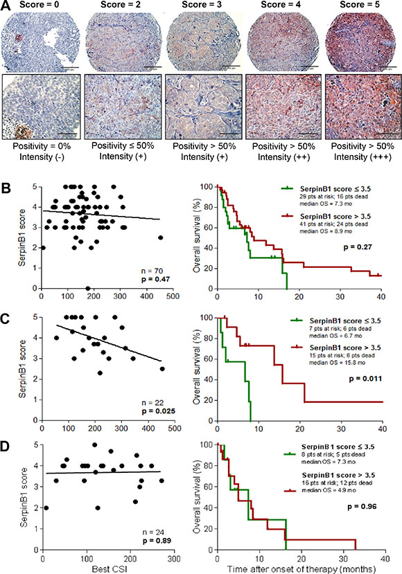 Figure 4: SERPINB1 protein expression in melanoma tissues correlates with in vitro and in vivo sensitivity to cisplatin-based chemotherapy. (A) SERPINB1 protein expression as detected by immunohistochemistry on tissue microarrays built from FFPE tissue samples. Representative tissue cores are shown for each value of the expression score. The score is defined as described in the Patients and Methods section. Magnification is 20x (upper row) and 40x (lower row), respectively. SERPINB1 protein expression in tumor tissue samples from patients of validation set 2 (n = 70; B), and its subsets of patients treated with cisplatin-based chemotherapy (n = 22; C) or DTIC monochemotherapy (n = 24; D). Left: Correlation of the SERPINB1 expression score with chemosensitivity indices (CSIs) from in vitro sensitivity testing by linear regression analysis. Right: Kaplan-Meier plots depicting the probability of overall survival subdivided by SERPINB1 expression score. Differences between groups were calculated using the log rank test. Censored observations are indicated by vertical bars.
