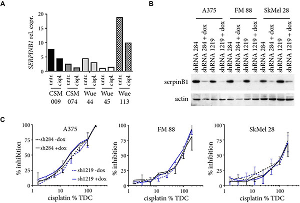Figure 5: Changes in SERPINB1 expression do not influence cisplatin sensitivity. (A) Five different melanoma cell lines were cultured for six weeks with increasing doses of cisplatin (6.25%, 12.5%, 25%, 50% TDC). Relative SERPINB1 mRNA expression as quantified by real-time PCR is depicted for cells harvested at the start (untreated; untr.) and the end of the experiment (cisplatin treated; cispl.). (B) Melanoma cells infected with SERPINB1-specific shRNA inducible vectors were cultured with or without doxycyclin for four days, and their lysates analyzed for SERPINB1 expression by immunoblotting. ACTIN served as loading control. (C) Melanoma cells with or without doxycycline(dox)-induced SERPINB1 knockdown by two different SERPINB1-specific shRNAs were treated for three day with different amounts of cisplatin (6.25% to 200% TDC) and analyzed by the MTS assay. Depicted is the percent inhibition for the given drug concentrations (%TDC) compared to control cells cultivated in normal medium. Given are means from two independent experiments with SD (upper orientation, without dox; lower orientation, with dox).