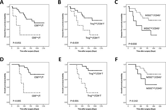 Figure 2: Disease-free and overall survival curves of gastric cancer patients according to the proportions of CD8+ T cells among CD3+ T cells (A, D), regulatory T cells (Tregs) among CD4+ T cells (B, E), and Myeloid derived suppressor cells (MDSCs) among CD45+ leukocytes (C, F).
