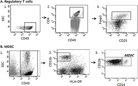 We defined helper T cells as CD45+ CD3+ CD4+, cytotoxic T cells as CD45+ CD3+ CD8+, Tregs as CD45+ CD4+ CD25± and FOXP3+, and MDSCs as CD45+ CD11b+ HLA−DR− and CD14+ [21, 22, 27, 44–48] (Figure 3). The frequency of each cell subgroup among the total examined cells was determined. We also assessed the percentages of the following immune cell subsets among leukocytes: CD8+ T cells among CD3+ T cells, Tregs among CD4+ T cells, and MDSCs among total CD45+ leukocytes. To identify optimal cutoffs with the highest statistical significance for patient survival, we used X-Tile statistical software (Yale University, New Haven, CT, USA) [49] and grouped the cases into low- and high-density groups for each marker following dichotomization.