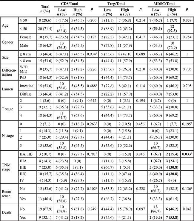 Table 2: Clinicopathologic features according to the proportions of CD8+ T cells, regulatory T cells, and myeloid derived suppressor cells among total cells