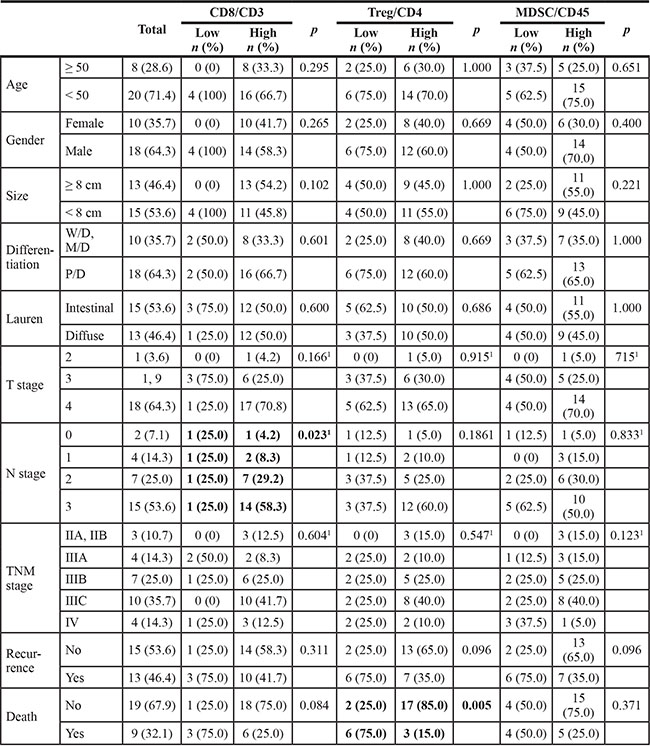 Table 3: Clinicopathologic features according to the proportions of CD8+ T cells among CD3+ T cells, regulatory T cells among CD4+ helper T cells, and myeloid derived suppressor cells among CD45+ leukocytes