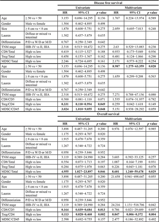 In conclusion, we have demonstrated that high levels of Tregs among tumor-infiltrating CD4+ T cells were favorable, but an increased proportion of MDSCs was an adverse independent prognostic factor in GC. Our results may provide important insights for further classification of GC based on immunological feature and also for future immunotherapy in GC.