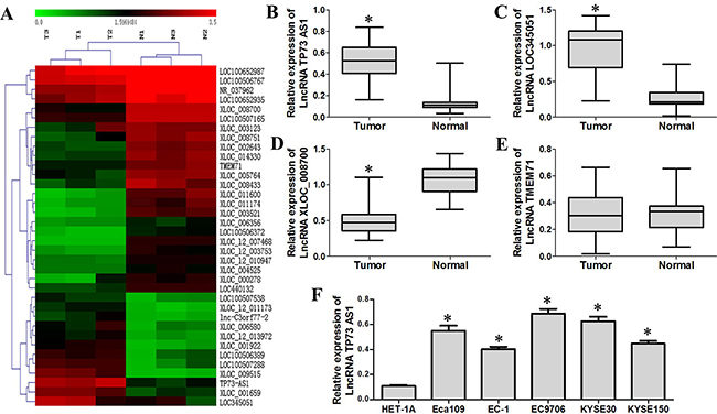 Figure 1: LncRNA TP73-AS1 is upregulated in EC. A. LncRNA microarray analysis was performed on total RNA isolated from three esophageal squamous cell carcinoma tissue samples and corresponding adjacent normal esophageal tissues. T: tumor, N: normal. B. & C. qRT-PCR results show that LncRNA TP73-AS1 and LOC345051 levles in EC tissues was increased as compared to adjacent non-cancerous tissues. D. LncRNA XLOC_008700 expression in EC tissues was decreased as compared to adjacent non-cancerous tissues E. No significant difference was observed for lncRNA TMEM71 between EC tissues and corresponding adjacent normal esophageal tissues F. LnRNA TP73-AS1 expression was generally upregulated in EC cell lines (Eca109, EC-1, EC9706, KYSE30 and KYSE150) compared with the normal esophageal cell line, HET-1A. (*P < 0.05)