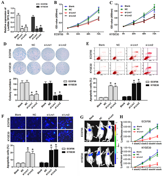 6-week-old female BALB/c nude mice were purchased from Henan Experimental Animals Centre Zhengzhou, China. EC9706 and KYSE30 cells were stably transfected with luciferase. The mice were randomly divided into three groups for each cell line, and each group consisted of five mice. Group si-lnc1: cells were transfected with lncRNATP73-AS1 siRNA1; Group NC: cells were transfected with nonsense siRNA; Group Blank: un-transfected cells. EC9706 and KYSE30 cells transfected with lncRNA TP73-AS1 siRNA1 were injected subcutaneously at 5×107 cells. At 7, 14, 21, or 28 days, mice were injected intraperitoneally with D-luciferin (150 mg/kg) and analyzed using the Xenogen-IVIS Imaging System. The luciferase area of the xenograft tumor was defined as the region of interest (ROI), and the total signal in the ROI was quantified using the software, Living Image 3D (Xenogen). The Zhengzhou University Animal Care and Use Committee approved these protocols.