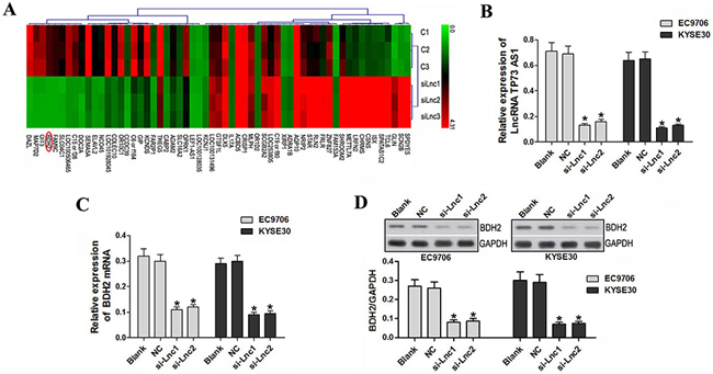 Our study serves as the first comprehensive analysis of lncRNA TP73-AS1 in EC. We selected lncRNA TP73-AS1 as the target gene based on lncRNA profiles, and then designed lncRNA TP73-AS1 siRNA to block TP73-AS1 expression, and thus attenuate proliferation and invasion of ESCC. We found that lncRNA TP73-AS1 siRNA inhibits EC cell proliferation and induces cell apoptosis by regulating BDH2. Our results also suggest that downregulation of lncRNA TP73-AS1 and BDH2 induced apoptosis via a caspase-3 dependent pathway. These results are in agreement with the findings of Yang, et al. that BDH2 works as an anti-apoptotic factor [13]. It is also possible that there are other factors that could contribute to the regulation of this protein. Yu, et al. reported that lnRNA TP73-AS1 is significantly downregulated in non-small cell lung cancer as compared to normal lung tissues (P<0.001), but it is strongly upregulated in large-cell carcinoma specimens compared to adenocarcinoma, small-cell lung cancer and squamous cell carcinoma tissues [37]. These findings indicate that lnRNA TP73-AS1 may play an important role in the development and progression of various tumors.