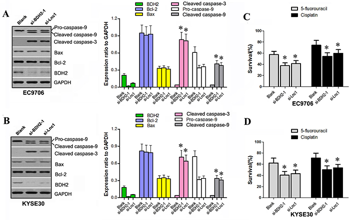 Caspase activation plays a central role in cell apoptosis. Caspase-3 and caspase-9 are the most frequently activated cell death proteases, and catalyze the specific cleavage of various key cellular proteins [24]. Our western blot assay showed that cleaved caspase-3 and cleaved caspase-9 protein levels were enhanced in BDH2 and lncRNA TP73-AS1 knockdown cell lines, respectively. However, expression of Bcl-2, Bax and pro-caspase-9 did not significantly differ following siRNA transfection. We inferred that knockdown of lncRNA TP73-AS1 or BDH2 induced cell apoptosis via a caspase-3 dependent apoptosis pathway.