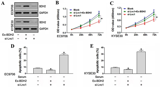 Recombinant lentiviral vectors carrying lncRNA TP73-AS1 siRNA1, TP73-AS1 siRNA2, BDH2 siRNA1 or BDH2 siRNA2 were constructed with standard molecular techniques. EC9706 and KYSE30 cells were infected with the recombinant lentivirus to generate stably transfected cells. Concentrated lentiviruses were transfected at a multiplicity of infection (MOI) of 40 in RPMI-1640 without FBS. The supernatant was replaced with complete culture medium after 24 hours. The expression of lncRNA TP73-AS1 and BDH2 in infected cells was validated by quantitative real-time polymerase chain reaction (qRT-PCR). LncRNA TP73-AS1 and BDH2 siRNA sequences are in Supplementary Table S1.