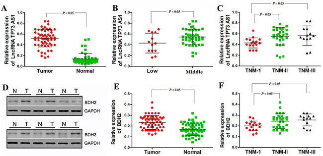LncRNA TP73-AS1 expression was also strongly correlated with tumor location and TNM stage, but not with gender, age, differentiation or lymph metastasis (Table 3). BDH2 expression was strongly correlated to TNM stage only. LncRNA TP73-AS1 expression was lower in low EC locations and during stage I, whereas middle EC locations and stages II–III exhibited higher levels, which were indicative of a significant correlation between lncRNA TP73-AS1 level and clinicopathologic stage (Figure 7B & 7C, Table 3). Similarly, BDH2 expression was lower during stage I, whereas stages II–III showed higher levels, indicating a correlation between BDH2 expression and TNM stage (Figure 7F, Table 3). These results provide strong evidence that lncRNA TP73-AS1 and BDH2 expression are closely related to the TNM stage of EC.