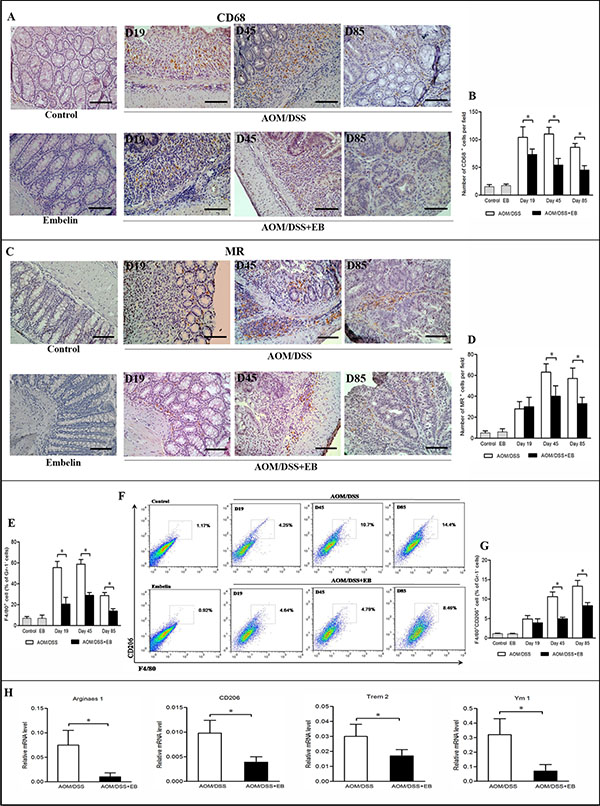 Figure 1: Embelin (EB) altered macrophage population during CAC development. Immunohistochemical analysis of the pan-macrophage marker CD68 (A) and M2 macrophage marker MR (C) at days 19, 45 and 85 after AOM/DSS treatment. Scale bar: 50 μm. The number of CD68+ (B) and MR+ macrophages (D) per field was counted (n > 10 fields/group). For flow cytometric analysis, immunocytes were extracted from colonic tissues and stained with anti-F4/80, anti-CD206, and anti-Gr1 antibodies. (E) The percentage of F4/80+ macrophages among total Gr-1− cells. (F) The blot shown was gated on Gr-1− cells, F4/80 and CD206 flow plot was used to identify M2-like TAMs. F4/80+CD206+ macrophages among total Gr-1− cells were quantified (G. H). Colon tissues were collected at day 85 after AOM/DSS administration and mRNA levels of M2 genes Arginase1, CD206, Trem2 and Ym1 were determined by qPCR. Data are expressed as mean ± SD (n = 6–8/group; *p < 0.05).