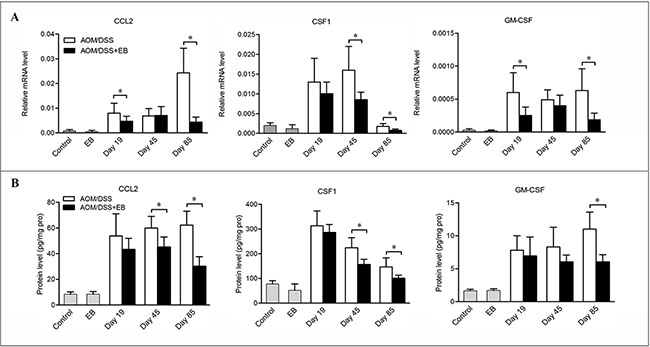 Figure 2: Embelin decreased chemokines expression in CAC model. Colon tissues were collected at days 19, 45 and 85 after CAC challenge and mRNA (A) and protein (B) levels of CCL2, CSF-1 and GM-CSF were determined by qPCR and ELISA. Data are expressed as mean ± SD (n = 6–8/group; *p < 0.05).