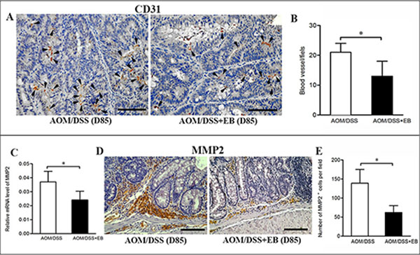 Figure 4: Embelin decreased vascularity and MMP2 expression in late carcinoma stage. (A) Vascular density in colonic tumors from mice treated with or without embelin at day 85 was evaluated by immunostaining with anti-CD31 antibody. Scale bar: 50 μm. Data were quantified by blind counting of blood vessels per microscopic field (B). Relative mRNA expression of MMP2 in colonic tumor was analyzed by qPCR (C), and representative immunostaining of MMP2 in colonic tumor at day 85 after AOM/DSS exposure was shown (D). Scale bar: 50 μm. E. The number of MMP2+ cells per field was quantified (n > 10 fields/group). Data are expressed as mean ± SD (n = 6–8/group; *p < 0.05).