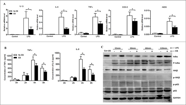 Figure 5: Embelin negatively regulated NF-κB signaling in macrophages. (A) Bone marrow-derived macrophages (BMDMs) were cultured and stimulated with LPS (500 ng/ml) in the absence or presence of embelin (20 μmol/L). Macrophages were collected at 6 h and mRNA was isolated for qPCR analysis of IL-1β, TNFα, IL-6, COX-2 and iNOS. (B) TNFα and IL-6 in cell culture supernatant at indicated time points after LPS stimulation were measured by ELISA. (C) Cell lysates collected at indicated time points were analyzed for p-IκBα, IκBα, p-IKKβ, IKKβ, p-p65 and p65 by Western blot. Data are expressed as mean ± SD. *p < 0.05. All results shown are representative of three independent experiments.