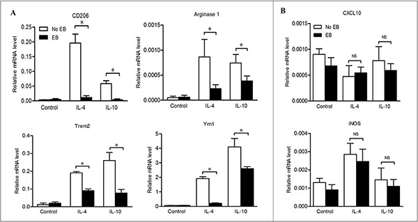 Figure 6: Embelin reduced M2 macrophage polarization in the presence of Th2 cytokines. BMDMs were exposed to IL-4 or IL-10, in the presence or absence of embelin as described in Materials and Methods. M2 genes CD206, Arginase1, Trem2 and Ym1 (A) and M1 genes CXCL10 and iNOS (B) were analyzed by qPCR. Data are expressed as mean ± SD. *p < 0.05. NS, not significant. All results shown are representative of three independent experiments.