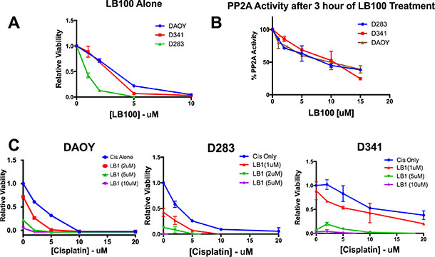Figure 1: LB100 reduces MB cells viability, PP2A activity and enhances cisplatin mediated cytotoxicity in vitro. Three MB cell lines cell lines DAOY, D283 and D341 were used in vitro. XTT assays were performed after 48 hours of treatment. (A) Increasing concentrations of LB100 reduces cell viability in a dose dependent manner. (B) PP2A activity was measured based on a phosphatase assay and expressed as a percentage of control. After 3 hours of LB100 treatment, PP2A activity was decreased in a dose-dependent fashion in all three cell lines. (C) Cells were treated with various combinations of LB100 and cisplatin. Increasing LB100 enhances cisplatin-mediated cytotoxicity. LB100 was given as pre-treatment 3 hours prior to giving cisplatin. Data are represented as mean +/− SEM.