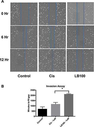 Figure 3: LB100 inhibits MB cell motility and migration. Culture insert acting as a barrier between two wells plated with DAOY cells were removed leaving a 500 um gap for cells to migrate. Cells were treated with vehicle control (PBS), LB100 or cisplatin at 1 μM. Serial time-lapse images were taken every 15 mins for 48 hours. Representative images for each condition taken at 6 and 12 hours were shown. The time it takes for the cells to populate the 500 um gap was then compared. Statistically significant differences are marked by an asterisk (*p ≤ 0.05). Data are represented as mean +/− SEM.