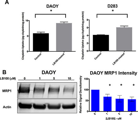 Figure 6: LB100 decreases cisplatin uptake and is associated with down-regulation of MRP1. (A) DAOY and D283 cells were treated with 2.5 μM of LB100 for 24 hours followed by 5 μM cisplatin for 1 hour. ICP-MS was then used to measure the total whole cell cisplatin level. LB100 treated cells showed a significant increase in cisplatin level suggesting PP2A inhibition affect cisplatin influx or efflux. (B) Western blot with densitometry was performed on DAOY cells demonstrating LB100 treatment resulted in a significant decrease in expression of MRP1, a known ATP-binding cassette (ABC) drug transporter involved in cisplatin efflux. Statistically significant differences compared to control are marked by an asterisk (*p ≤ 0.05). Data are represented as mean +/− SEM.