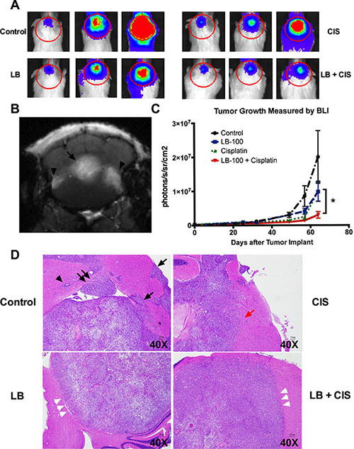 Figure 8: LB100 in combination with cisplatin significantly decreases tumor burden in vivo. After implantation of FLuc-expressing DAOY cells, mice were randomized into four treatment groups [vehicle (PBS) control (n = 7), LB100 (1.5 mg/kg; n = 6), cisplatin (1.5 mg/kg; n = 5), and LB100 (given 1 hour before cisplatin) + cisplatin (n = 5)]. After completion of treatment, tumor growth was monitored with whole body bioluminescence (BLI) every 1-2 week. (A) Representative BLI images were shown for a mouse in each treatment group on POD 10, 39 and 64. (B) MRI of the brain with gadolinium contrast of a representative mouse in the control group prior to sacrifice was performed to characterize the xenograft tumor. The MRI demonstrated the xenograft closely recapitulate the findings in human MBs, with a homogenously enhancing lesion in the cerebellum, invasion of the fourth ventricle (arrow) and leptomeningeal spread (arrow heads). (C) Tumor burden was assessed with serial BLI. By POD64, the mean bioluminescent signal was significantly lower in the combination group than the cisplatin group. Statistically significant differences are marked by an asterisk (*p ≤ 0.05). Data are represented as mean +/− SEM. (D) Histologic features of tumors in the cerebellum at survival endpoint of the animals were examined. In control group, tumors exhibited nodular invasion of the parenchyma and pia (black arrows), perivascular spread (black arrowhead) and intraventricular involvement (double arrows). In the cisplatin treated group, tumors were less invasive in appearance but continued to show parenchymal invasion at the border of the tumors (red arrow). In both LB100 treated groups, the tumors were markedly more circumscribed with a clear demarcating border between tumor and parenchyma (white arrowheads).