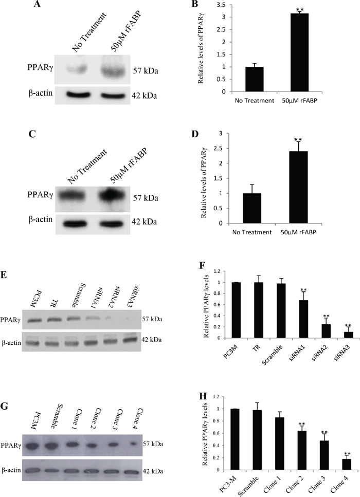 Figure 1: Increased expression of PPARγ by rFABP5 in LNCaP and 22RV1 cells and establishment of colonies expressing reduced level of PPARγ by siRNA in PC3-M cells. Quantitative analysis of the levels of PPARγ in different cells was performed by densitometry scan of the intensities of the bands of the Western blots. Quantitative results were obtained from 3 repeated blot analyses. A. Western blot of PPARγ in untreated LNCaP cells and in cells treated with 50μM rFABP5 at presence of 2μM myristic, palmitic, oleic and linoleic acids for 24h. B. Quantitative analysis of PPARγ in control and in rFABP5 treated (at the presence of long chain fatty acids) LNCaP cells. The level of PPARγ in untreated control cells was set at 1; and the level in rFABP5 treated cells was obtained by relating that to the control. C. Western blot of PPARγ in untreated 22RV1 cells and in cells treated with 50μM rFABP5 at presence of 2μM myristic, palmitic, oleic and linoleic acids for 24h. D. Quantitative analysis of PPARγ in control and in rFABP5 treated (at the presence of long chain fatty acids) 22RV1 cells. The level of PPARγ in untreated control cells was set at 1; and the level in rFABP5 treated cells was obtained by relating that to the control. E. Western blot of PPARγ in parental PC3-M cells, cells treated with transfection reagent (TR) only, or cells transfected transiently with scrambled RNA and 3 different siRNA molecules. To standardize the immuno-blot reaction, an anti-β-actin was incubated with the same blot. F. Quantitative analysis of the levels of PPARγ in PC3-M cells after transient transfection. The level of PPARγ in parental PC3-M was set at 1; Levels in other transfected cells were obtained by comparison with that in PC3-M. G. Western blot analysis of the levels of PPARγ in parental PC3-M cells, cells transfected with scrambled shRNA and 4 different clones derived from siRNA-3 stable transfectants. An anti-β-actin was incubated with the same blot to normalize possible loading errors. H. Quantitative analysis of the levels of PPARγ in parental PC3-M cells, the scrambled shRNA control cells and 4 different clones derived from RNAi-3 stable transfectants. The level of PPARγ in parental PC3-M was set at 1; Levels in other transfected cells were obtained by comparison with that in PC3-M.