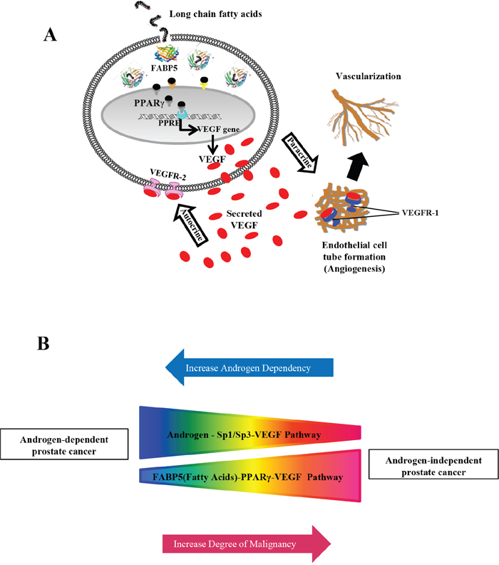 In this work, experiments have been performed to study the molecular mechanisms of how FABP5 (or fatty acids transported by FABP5) transduces signals that eventually lead to an involvement in increased VEGF and facilitated malignant progression of prostate cancer cells in both androgen-dependent and particularly in androgen-independent subtypes.