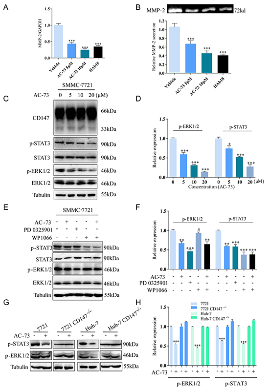 Figure 4: Molecular mechanism of action of AC-73 in HCC cells. A. The effect of AC-73 on MMP-2 mRNA level in SMMC-7721 cells. MMP-2 mRNA levels were detected using real-time PCR after treatment with DMSO or different concentrations of AC-73. Here, 20 μg/ml HAb18 was used as a positive control. B. Gelatin zymography analysis of MMP-2 secretion. Top, representative image; bottom, quantification of the grayscale analysis in three independent experiments. C, D. CD147, ERK1/2 and STAT3 activities and total ERK1/2 and STAT3 expression were examined in SMMC-7721 cells treated with different concentrations of AC-73. E, F. ERK1/2 and STAT3 activities and total ERK1/2 and STAT3 expression were examined in SMMC-7721 cells with different treatments. AC-73 was used at a concentration of 10 μM, the ERK1/2 inhibitor PD0325901 was used at 1 μM, and the STAT3 inhibitor WP1066 was used at 10 μM. G, H. ERK1/2 and STAT3 activities were examined in total lysates of HCC and HCC CD147-/- cells using Western blotting. All the Histograms show quantification of the gray scale analysis for western blotting. The bars represent each sample performed in triplicate and the error bars indicate ± SD. (***P < 0.001, **P < 0.01, *P < 0.05, #P > 0.05), one-way ANOVA (H) for multiple comparisons (A, B, D and F), Student’s t-test for two comparisons (H).