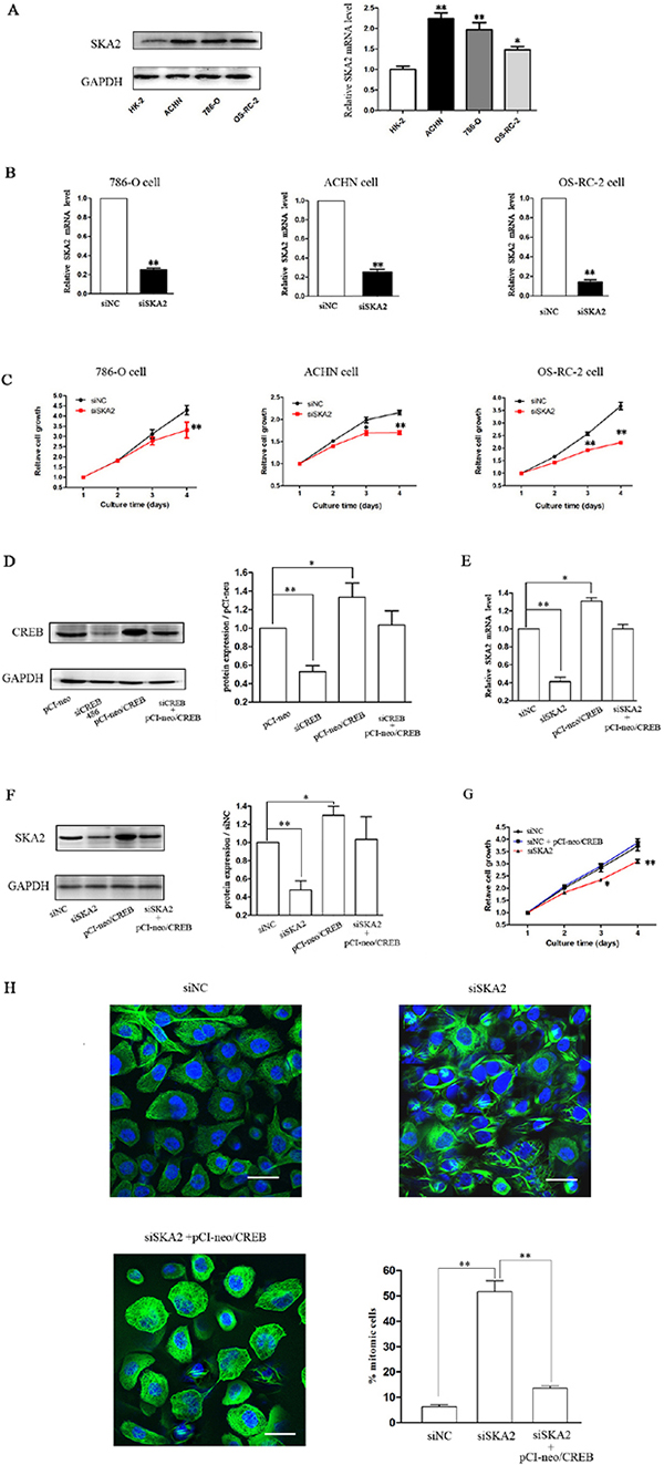 Figure 4: SKA2 is involved in CREB-regulated cell proliferation. The mRNA and protein levels of SKA2 in RCC cells were significantly higher than HK-2 cell (A). After cells were transfected with siSKA2, the mRNA levels were significantly decreased (B), cell proliferation was inhibited (C). However, overexpression of CREB in OS-RC-2 cells co-transfected with pCI-neo/CREB (D), reversed siSKA2-reduced mRNA level (E), protein levels (F), cell growth (G) and cell division (H). Data are shown as mean ± SD from three independent experiments. *P < 0.05, **P < 0.01 versus HK-2 cell or siNC treatment. Scale bar, 10 μm.