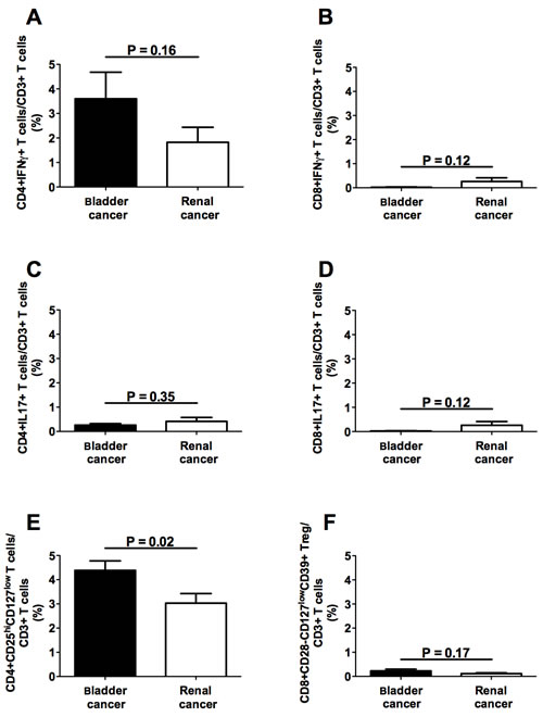 Figure 1: Frequencies of circulating T cell subpopulations in bladder and renal cancer patients. Panels A, B, C and D refer to analyses performed on CD4+IFNγ+, CD8+IFNγ+, CD4+IL17+, and CD8+IL17+ T lymphocytes, respectively, comparing the frequencies of each of the above T cell subsets in bladder or renal cancer specimens; panels E and F refer to comparative analyses performed between CD4+CD25hiCD127lo and CD8+CD28-CD127loCD39hi Treg subsets derived from either bladder or renal cancer specimens, respectively; Black bars: analyses performed on cells from bladder cancer patients; open bars: analyses performed on cells from renal cancer patients.