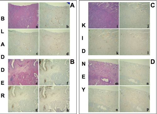 Figure 3: Hematoxylin-Eosin stain and immunohistochemistry for CD3+, CD4+, CD8+ T cells on. A. a poorly differentiated urothelial carcinoma of the bladder B., the autologous histologically free-of-tumor bladder tissue (both from patient #1), C. a papillary type II renal cell carcinoma and D. the autologous histologically free-of-tumor cortical renal tissue (both from patient #30). a, e, i, m: Haematoxylin-Eosin stain (4x magnification); b, f, j, n: immunohistochemistry using an anti-CD3 antibody (4x magnification); c, g, k, o: immunohistochemistry using an anti-CD4 antibody (4x magnification); d, h, l, p: immunohistochemistry using an anti-CD8 antibody (4x magnification). a-h: an intense T lymphocyte infiltrate is shown both in the tumour and the histologically free-of-tumor mucosa; lymphocytes are sparse or in nodular aggregates and localize between neoplastic cells as well as in the interstitium. In non-neoplastic mucosa a comparable infiltrate is seen both in the intraepithelial tissue and in the subepithelial connective tissue. i-p: While the tumor shows an evident T lymphocyte infiltrate, rare T lymphocytes are present in the non-neoplastic epithelium.