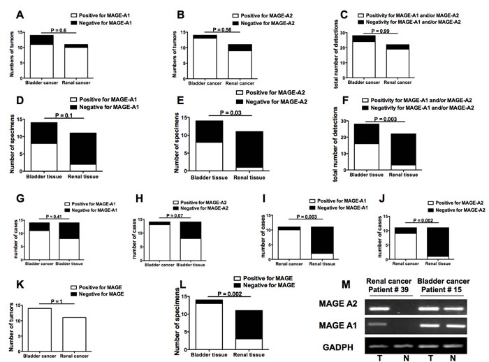 Figure 5: Frequencies of MAGE-A1 and MAGE-A2 gene expression in bladder and renal cancers as well as in bladder and renal apparently free-of-tumor tissues. A. frequency of bladder or renal tumor showing or not MAGE-A1 gene expression; B. frequency of bladder or renal tumors showing or not MAGE-A2 gene expression; C. frequency of detections on bladder or renal tumors that resulted positive or not for any MAGE gene expression; D. frequency of bladder or renal apparently free-of-tumor tissue showing or not MAGE-A1 gene expression; E. frequency of bladder or renal apparently free-of-tumor tissue showing or not MAGE-A2 gene expression; F. frequency of detections on bladder or renal apparently free-of-tumor tissue that resulted positive or not for any MAGE gene expression; G. comparisons of frequencies of tissue samples showing MAGE-A1 gene expression between bladder cancers and autologous apparently free-of-tumor bladder tissues; H. comparisons of frequencies of tissue samples showing MAGE-A2 gene expression between bladder cancers and autologous apparently free-of-tumor bladder tissues; I. comparisons of frequencies of tissue samples showing MAGE-A1 gene expression between renal cancers and autologous apparently free-of-tumor renal tissues; J. comparisons of frequencies of tissue samples showing MAGE-A2 gene expression between renal cancers and autologous apparently free-of-tumor renal tissues; K. frequencies of bladder or renal tumors showing positivity or not for at least one of the two MAGE molecule gene expression; L: frequencies of apparently free-of-tumor bladder or renal tissues showing positivity or not for at least one of the two MAGE molecule gene expressions; M. Representative MAGE antigen gene expression analyses performed by RT-PCR on specimens from bladder cancer patient #15 and renal cancer patient #39. The figure shows the amplicons obtained after MAGE-A1, MAGE-A2, and GADPH (as positive control) cDNA amplification in tumors (T) and apparently free-of-tumor tissues (N) run on agarose gel. Panels A-L: Open bars indicate presence of MAGE antigen gene expression while black bars indicate absence of MAGE antigen gene expression.