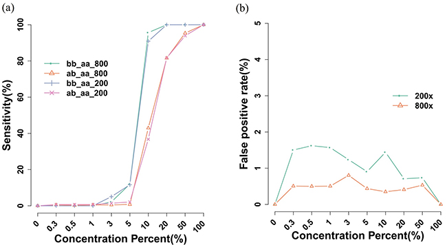 Using a second detection method, for each cell line dilution, we observed that at 10%, 100% homozygous and 93% heterozygous mutations were correctly detected in 800x coverage data. With more coverage, detection sensitivity can be much lower than 10%. The lowest detection sensitivity we achieved was 1.5% with a 50% detection rate (Supplementary Figure S6). Other methods may offer detection as low as 0.02% but detection rates are not reported [16]. Thus, our approaches might have potential for detecting minimal residual disease.