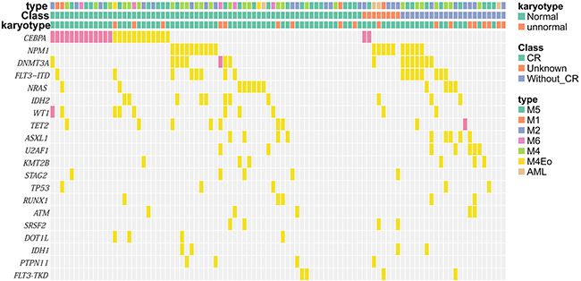 Figure 3: Mutation profile according to clinical features. Mutation profile according to clinical features (FAB category, clinical efficacy and karyotype). Significant mutations identified in AML patients are shown. Some mutations co-occurred or were exclusive and some were associated with specific clinical features. Yellow boxes indicate single mutations and pink boxes indicate double mutations.