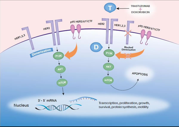 Larger studies are highly awaited for confirmation of p95HER2 as a biomarker of resistance or sensitivity to anti-HER2 therapy, enabling development of strategies to target this form of HER2. Evidence is accumulating indicating that trastuzumab alone is not effective in patients who have expression of p95HER2 isoforms. Figure 1 illustrates HER2 and p95HER2, along with their interactions with chemotherapy and trastuzumab, as well as proliferative molecular pathways.