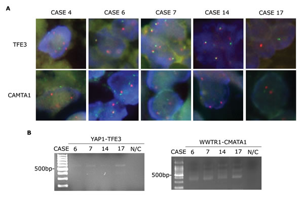 Next, we examined the 13 EHEs that were immunohistochemically TFE3 negative. FISH revealed that break apart occurred only within the CAMTA1 gene but not the TFE3 gene in these patients (Supplementary Data 2A). We repeatedly attempted to extract mRNA from these patients to perform RT-PCR but failed in 7 of 13 TFE3-negative EHE cases presumably due to mRNA degradation of the formalin-fixed, paraffin-embedded samples. RT-PCR of the other six cases from which we successfully extracted mRNA supported the presence of fusion transcripts of WWTR1-CAMTA1 genes but not YAP1-TFE3 genes (Supplementary Data 2B).