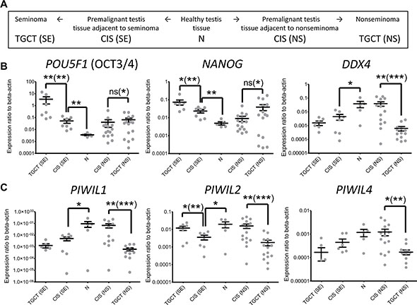 Figure 1: Expression of CIS and germ cell markers and PIWI protein genes in testis and testicular germ cell tumors. (A) Schematic description of the sample types used in the work and the approach to study normal-to-malignant transition. (B) Expression of carcinoma in situ markers POU5F1 (OCT3/4) and NANOG and germ cell marker DDX4. (C) Expression of PIWI protein genes PIWIL1, PIWIL2, and PIWIL4. Average value and SEM (Standard Error of the Mean) are shown for all samples. P value summary for Mann-Whitney non-paired U test and paired Wilcoxon signed-rank test (in brackets) are shown only for significant differences. Due to logariphmic scale several near-zero values are not depicted: DDX4 – 1 TGCT(SE), PIWIL1 – 1 TGCT(SE), PIWIL4 – 3 TGCT(SE), 1 CIS (SE), 1 CIS (NS) and 2 TGCT(NS).