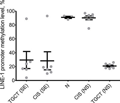 Figure 3: Integral methylation status of LINE-1 CpG islands. Melting curve analysis was used to obtain methylation level in healthy testis tissues (N), premalignant testis tissues (CIS samples) and testicular germ cell tumors (TGCT). SE – seminoma, NS – nonseminoma.