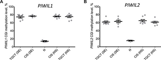 Figure 4: Integral methylation status of PIWIL1 and PIWIL2 CpG islands. Melting curve analysis was used to obtain methylation level of PIWIL1 (A) and PIWIL2 (B) CpG islands in healthy testis tissues (N samples), premalignant testis tissues (CIS samples) and testicular germ cell tumors (TGCT). SE – seminoma, NS – nonseminoma.