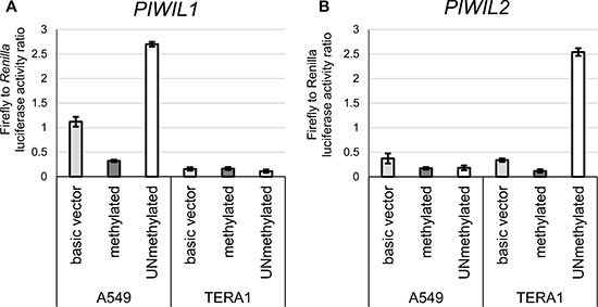 Figure 5: Luciferase reporter assay with methylated or unmethylated PIWIL1 and PIWIL2 promoters. Luciferase reporter constructs pGL4.10 with either methylated or unmethylated PIWIL1 (A) or PIWIL2 (B) promoter were transfected into TERA1 and A549 cells. The basic vector (no promoter control) was used as the reference.