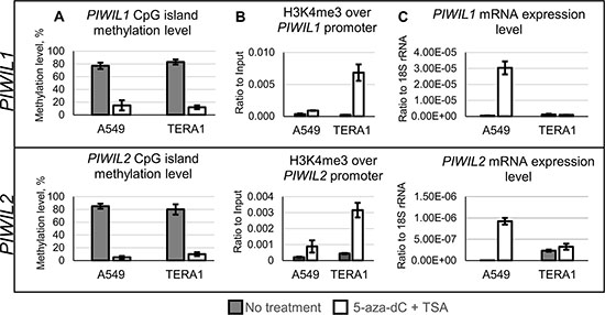 As expected, in A549 cells promoter demethylation led to an increase in H3K4me3 (histone methylation mark of active transcription, Figure 6B) and upregulated PIWIL1 and PIWIL2 expression (Figure 6C).