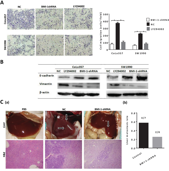 To investigate whether BMI-1 is crucial for pancreatic CSCs metastasis in vivo, we performed an in vivo tumor cells metastasis assay. 1× 105 CD133+ CoLo357 cells, transfected with negative control shRNA (NC) or BMI-1-shRNA, were injected into the caudal vein of nude mice (n=10). There were seven mice in NC group and eight in BMI-1-shRNA group alive after 8 weeks. Four out of seven mice developed liver metastasis in NC group, however, only two mice developed liver metastasis in BMI-1-shRNA group (Fig. 5C). The results suggested that BMI-1 was a key player to promote pancreatic CSCs metastasis.