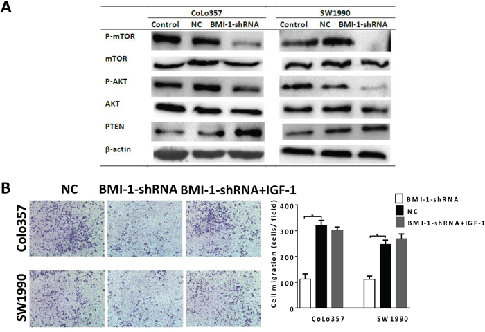 Figure 6: BMI-1 promoted invasion and metastasis ability of pancreatic CSCs by negative regulating PTEN and activating PI3K/AKT singing pathway. A. Expression of P-AKT and P-mTOR was decreased, whereas PTEN expression was increased after knockdown of BMI-1. B. IGF-1 facilitated the invasive when abrogation of BMI-1 (*P < 0.05 compared to NC). Data were summarized as means ± SD.