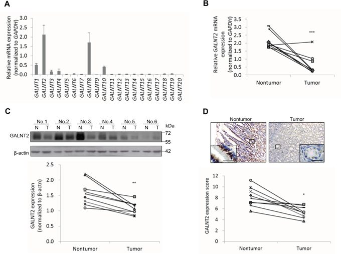 To investigate the potential role of GALNT family genes in gastric carcinoma (GC), we first analyzed the expression of GALNT1-20 in non-cancerous gastric mucosa using real-time RT-PCR. Among the 20 genes, only GALNT2 (2.1±0.5) and GALNT8 (1.7±0.5) were highly expressed in non-cancerous gastric tissue (Figure 1A). We further analyzed GALNT2 expression in paired GC and non-cancerous tissues (n = 9). GALNT2 expression was significantly lower in GC tissues (0.6±0.6) than in their non-cancerous parts (2.1±0.5) (Figure 1B, ***p < 0.001). GALNT2 protein expression was also consistently lower in GC tissues in Western blotting (Figure 1C) and immunohistochemistry (Figure 1D) experiments (n=9).