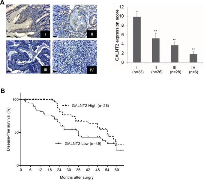 Figure 2: Relationships between GALNT2 expression and clinical features in GC. A. Representative immunohistochemical staining of GALNT2 in GC tissues from stage I to IV (left panel), and semi-quantitative immunoreactivity scores of GALNT2 expression in stage I to IV gastric cancers. Scale bars, 20μm. B. Diseased-free survival of GC patients with high and low GALNT2 expression. (**p < 0.005).