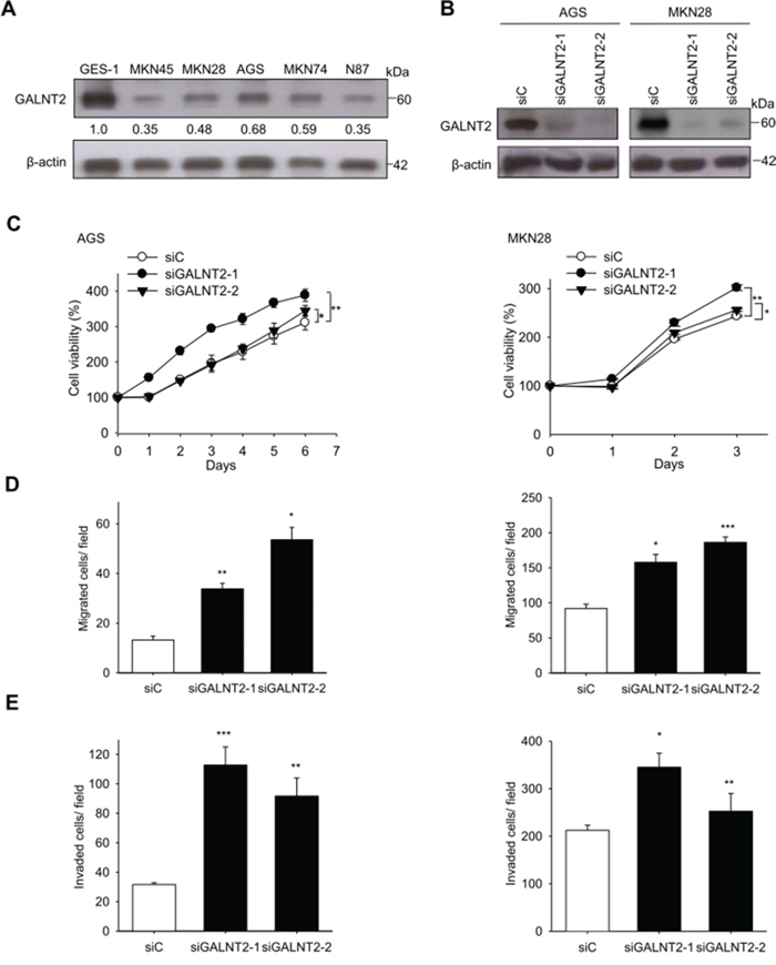 Figure 3: Effects of GALNT2 knockdown on malignant phenotypes in gastric cancer cells. A. Expression of GALNT2 in five GC cell lines and GES-1 cells. GALNT2 protein expression was analyzed by Western blotting. B. Transfection of siRNAs targeting GALNT2 (siGALNT-1 and siGALNT-2) or control siRNA (siC) in AGS and MKN28 cells. The efficiency of GALNT2 knockdown was confirmed by Western blotting. C. Cell viability was analyzed by MTT assay at different time points. The results were graphed after standardization by siC (Day0) to 1.0 (Left, AGS cells; right, MKN28 cells). D. Effects of GALNT2 on cell migration in transwell migration assays (Left, AGS cells; right, MKN28 cells). E. Effects of GALNT2 on cell migration in matrigel invasion assays (Left, AGS cells; right, MKN28 cells). Data are presented as mean ± SD from 3 independent experiments. (*p < 0.05; **p < 0.005; ***p < 0.001).