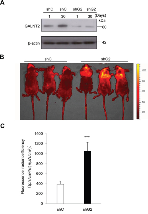 Figure 4: GALNT2 regulates gastric carcinoma cell metastasis in nude mice. A. Western blot analysis of GALNT2 expression 1 and 30 days after transfection in control (shC) and GALNT2 knockdown (shG2) cells. β-actin was used as an internal control. B. Representative IVIS images of nude mice 30 days after infusion of gastric cancer cells via the tail vein. Markedly enhanced fluorescence signals were detected in the thoracic region of shG2 group. C. Quantitative determination of fluorescence signal intensities in shC and shG2 mice. (n=9 for each group, ***p < 0.001).