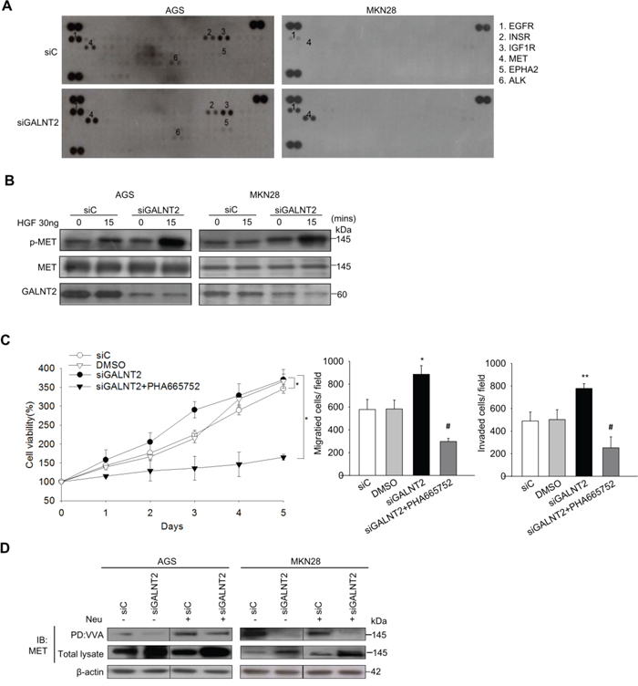 Figure 5: GALNT2 regulates MET activity in gastric cancer cells. A. Human p-RTK array showing the effect of GALNT2 on RTK phosphorylation. Cell lysates of control and GALNT2 knockdown AGS or MKN28 cells were applied to p-RTK arrays. B. GALNT2 modulated HGF-induced phosphorylation of MET. Control and GALNT2-knockdown AGS and MKN28 cells were treated with HGF (30 ng/ml) for 15 minutes, and lysates were analyzed by Western blotting. C. The effect of the MET inhibitor PHA665752 on GALNT2-enhanced cell viability, migration, and invasion. AGS cells were treated with 3 μM PHA665752 and then analyzed. Data are presented as means ± SD from three independent experiments. D. GALTNT2 regulated O-glycosylation of MET. Some AGS and MKN28 lysates were treated with neuraminidase (Neu) to unmask the effects of sialyation, and all were then incubated with VVA-conjugated agarose beads. Proteins pulled down by VVA were analyzed by immunoblotting (IB) with anti-MET antibody. Knockdown of GALNT2 decreased VVA binding to MET in AGS and MKN28 cells. Total lysate was used as loading control. (*p < 0.05; **p < 0.005; ***p < 0.001; siGALNT2 versus siGALNT2+PHA665752; #p < 0.005 ).