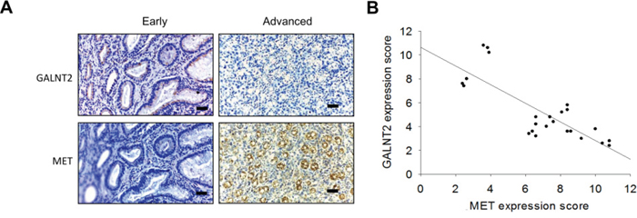 Figure 6: Correlation between GALNT2 and MET expression in GC tissues. A. Representative immunohistochemistry (IHC) staining of GALNT2 (upper panel) and MET (lower panel) in early (left) and advanced (right) stage gastric cancer tissues. B. Linear regression of IHC scores of GALNT2 and MET in gastric cancer (n=24). The correlation coefficient (r) was -0.801; p < 0.001. Scale bars, 40μm.